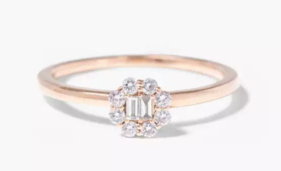 750 Roségold. Diamanten in Baguetteschliff und Brillantschliff von zus 0.20 ct. Gr. 53, 1 g.