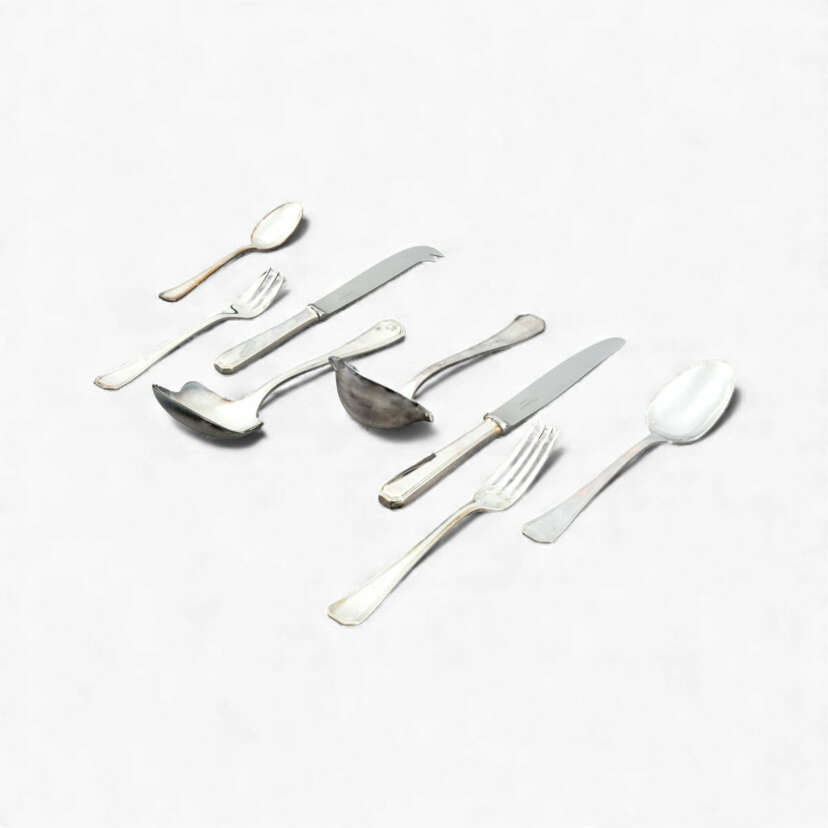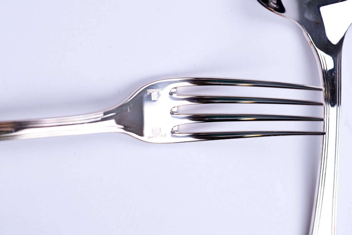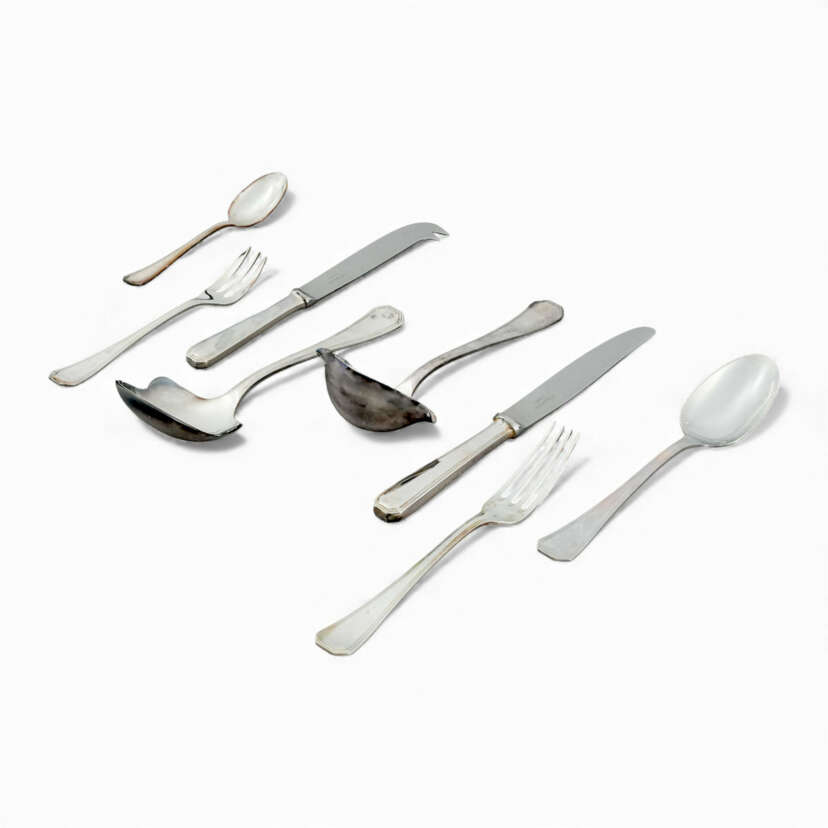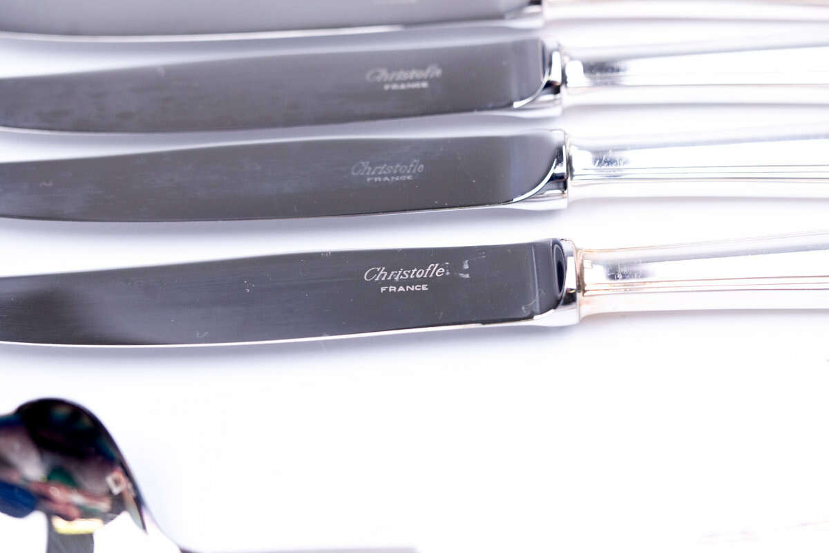 67 pieces, 12 forks, 12 knives, 12 large spoons, 12 cake forks, 12 teaspoons, 1 sauce ladle, 1 butter knife, 2 large serving spoons, 1 meat fork, 1 sauce spoon, 1 large serving spoon, Christofle with manufacturer's hallmark, design from 1933, silver-plated, 2 Christofle cardboard boxes included, 14 items still in original shrink wrap, otherwise minimal signs of wear in the form of scratches and slight abrasions