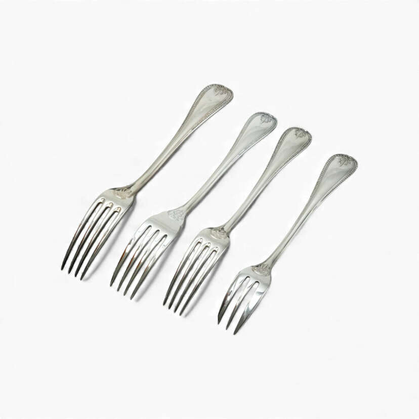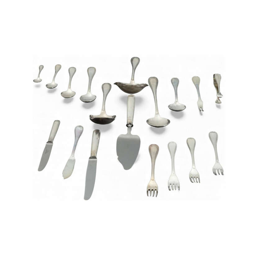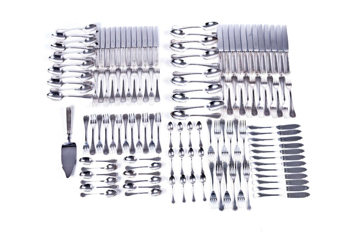 Comprising 140 pieces, silver-plated, Christofle with manufacturer's marks, consisting of 12 table forks, 12 table knives, 12 table spoons, 12 smaller spoons, 12 smaller forks, 12 fish knives, 12 fish forks, 12 cake forks, 12 dessert knives, 12 dessert spoons, 12 mocha spoons, and 8 serving pieces (cake server, sauce ladle, sugar tongs, cold meat forks etc.), in exclusive Christofle textile pouches, cake server in original cardboard box, overall in excellent condition with only minimal surface scratches