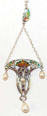 Collier im Jugend-Stil, 925er Sterlingsilber, mehrfarbige Fensteremaille in Gelb, Grün und Rosa, 3 beweglich montierte SW-Perlen, 9 echte Rubine, im Mittelteil, Länge verstellbar von ca. 40,5 - 45,5 cm