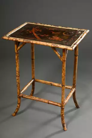 Colonial side table with bamboo frame and lacquered top, ‘Bird and Branches’, circa 1900, 72x55x40cm, signs of use