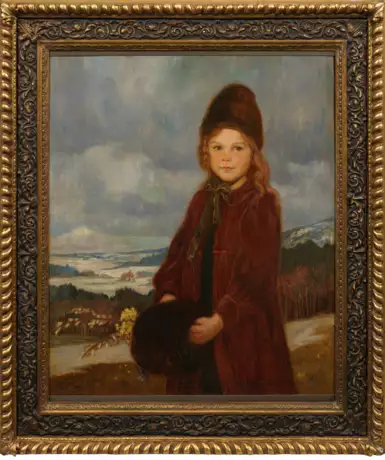 Reizvolles, mit weichem Schmelz gemaltes, einfühlsames Dreiviertelporträt eines blonden Mädchens in einem warmen Mantel mit Pelzmütze und Muff, dem Betrachter mit offenem Ausdruck und leuchtenden Augen freundlich entgegenblickend. Die weite Landschaft im Hintergrund mit bereits eingesetzter Schneeschmelze sind zusammen mit den Weidenkätzchen und gelben Primeln in ihrer Hand erste Frühlingsvorboten. 1910 entstandenes, in Motiv und Stil charakteristisches Werk des Künstlers im Stil der "Jugend". Corneille Max erhielt seine erste künstlerische Ausbildung bei seinem berühmten Vater, dem "Malerfürsten" Gabriel von Max und vollendete sie an der Münchener Kunstakademie bei Gabriel von Hackl und der privaten, modernen Kunstschule von Anton Azbé in München. Ab 1907 stellte er regelmäßig mit Erfolg im Münchener Glaspalast und in der Münchener Künstlergenossenschaft aus. Besonders mit seinen Kinderbildern hatte er großen Erfolg. Öl/Lwd.; L. u. sign. u. dat. (19)10. 93 cm x 81 cm. Dekorativer Prunkrahmen.