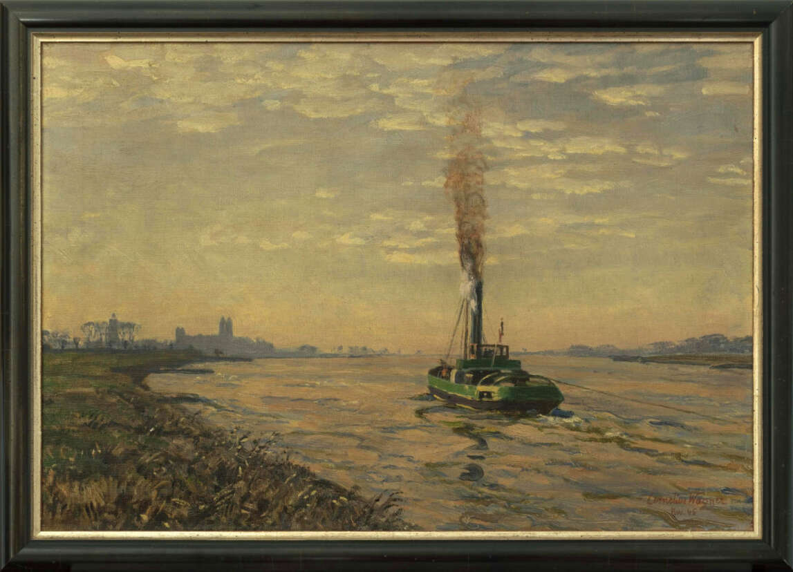 Steamboat on the Rhine near Kaiserswerth, oil on canvas, 45 x 65 cm canvas dimensions, signed, dated 45, KW localised, slightly craquelured, in need of cleaning