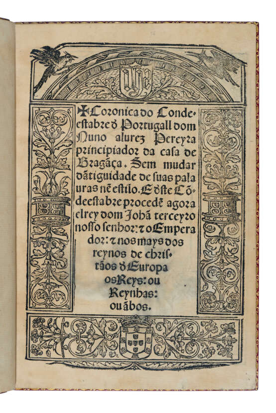 Second edition of this important history of Saint Constable, i.e. Nuno Álvarez Pereira, who assured Portugal's independence from Castile. The only copy of any 16th century edition to appear in the auction records of RBH. Through the marriage of his daughter Brites to Dom Affonso, the natural son of King João I of Avis and the first Duke of Braganza, Nuno became the founding patriarch of the House of Braganza. He played a pivotal role in securing Portugal’s independence during the 1383-1385 Crisis, leading decisive victories that safeguarded the nation from Castilian rule. In his later years, he became a Carmelite monk and is venerated in the Catholic Church. He was canonized by Pope Benedict XVI in 2009. There are two large woodcut portraits of Álvares Pereira in this work: one depicting him as a warrior-prince in full armor, and the other as an older monk. Anselmo 620; Iberian Books before 1600, 2875; Rodrigues 661.