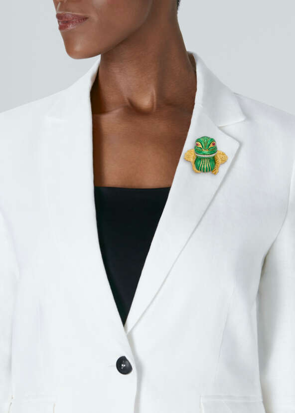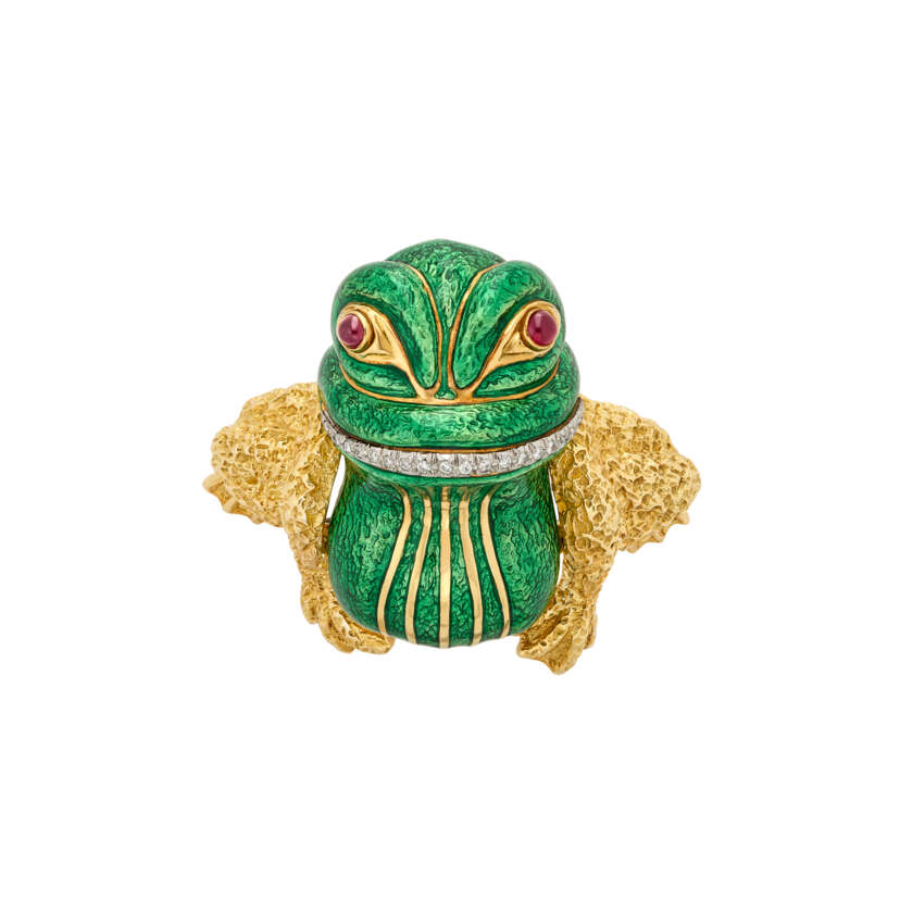 Lot 100 | DAVID WEBB ENAMEL, RUBY AND DIAMOND FROG BROOCH