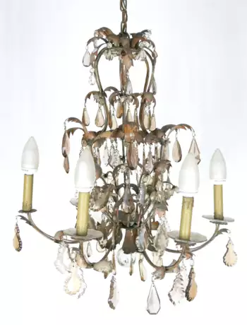 Lot 1040 | Deckenleuchter, Metall, Blattverzierungen, mit Prismenbehang, 6-flammig, H. 75 cm, Dm. 61 cm