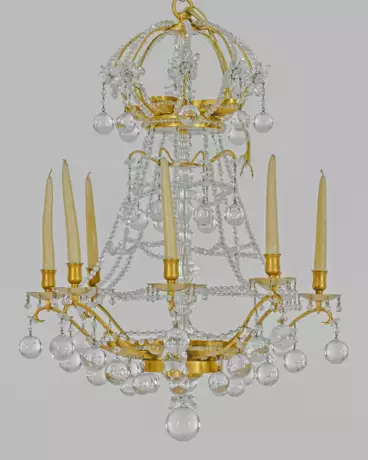 8-flg.; Metall, vergoldet und farbloses Glas. Balusterförmiger, offen gestalteter Korpus aus gitterartig angelegten Prismenschnüren. Unterhalb davon ausgehend geschweifte Leuchterarme als Träger für Kerzentüllen. Korrespondierender oberer Abschluss sowie reicher Behang aus Kugelelementen. Innen zwölf Lampenfassungen, elektrifiziert. H. 75 cm. D. 54 cm.
