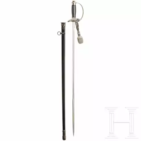 Vernickelte Klinge mit Herstellerbezeichnung "WKC" sowie "Gahr"-Punze, orig. Stoßleder, schwarzer Holzgriff mit intakter Drahtwicklung und eingesetztem Polizeiadler, vernickelte Griffbeschläge (magnetisch), die Scheide mit Originallackierung, diese zu ca. 99 % erhalten, die Beschläge ebenfalls vernickelt und magnetisch, alle Schrauben vorhanden, anbei das orig. SS-Portepee. Etwas Rost an den Griffbeschlägen, ansonsten ein schöner und unberührter Degen. Länge ca. 101 cm. Träger war ein SS-Obersturmführer der Reserve, Kriegseinsatz von Juni 1940 bis Juli 1944, im Juli 1944 gefallen. Er diente bei der SS-Panzer-Division "Hohenstaufen", ebenso besuchte er die SS-Junkerschule Bad Tölz. Direkt aus Familienbesitz.