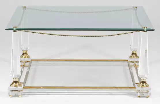 Messing, vergoldet, Acrylglas und farbloses Glas. Mehrfach gegliederte, gekantete Balusterbeine, durch schmale Stege verbunden. Quadratische Deckplatte sowie unterhalb korrespondierendes Ablagefach. H. 48 cm. 100 cm x 100 cm.
