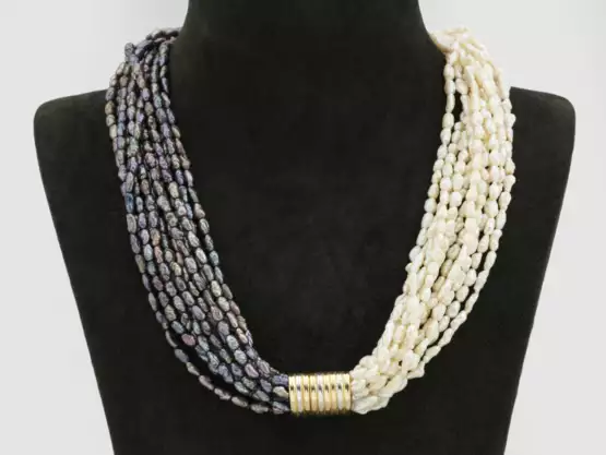 Gelb- und Weißgold, gest. 585. 12-reihige Kette mit schwarzen und weißen Biwa-Perlen von ca. 3 mm mit sehr farbintensivem, rosé-grün changierendem Lüster. L. ca. 42 cm. Gew. ca. 76,37 g.
