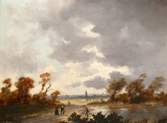 Lot 30 | Demmin, Erich (1911Ivenack, Mecklenburg-1997 Berlin) "Weite Landschaft mit Stadtsilhouette und Personen", Öl/ Hartfaser, sign. u.l., 40,5x50 cm, Rahmen (Landschafts- und Marinemaler, 1931-1938 Studium an der Ho…