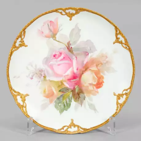 Runde, leicht vertiefte Form mit passig geschweiftem, reliefiertem Rocaillerand aus Biskuitporzellan. Im Spiegel ein groß angelegtes Bukett aus blühenden Rosen in zarttoniger, polychromer, teilw. weißgehöhter Weichmalerei von Hermann Friedrich Ismer (geb. 1874, in der KPM seit 1893 ausgebildeter Blumenmaler). Unw. rest.; Minim. ber.; Zepter- und Malereimarke. D. 22 cm.