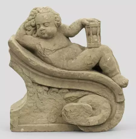 Sandstein. Vollplastische Vanitas- bzw. Memento Mori-Darstellung eines auf einer Volutenspange liegenden Puttos mit dem Betrachter zugewandtem Gesicht, seine linke Hand auf ein auf dem rechten Oberschenkel stehendes Stundenglas gestützt. Besch.; Ca. 36 cm x 36 cm x 14 cm.