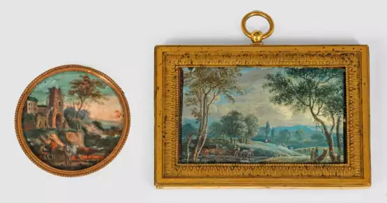 Runde Landschaft mit Kuh-Gruppe vor verfallenem Tor bzw. rechteckige Darstellung mit frühlingshafter Landschaft mit Bergkette am Horizont, staffiert mit vereinzelten Menschen und einer vierspännigen Kutsche. Tempera bzw. Gouache/ Elfenbein bzw. Papier. D. 6,5 cm. 12 cm x 10 cm. Messingrahmen mit Aufhängeöse.