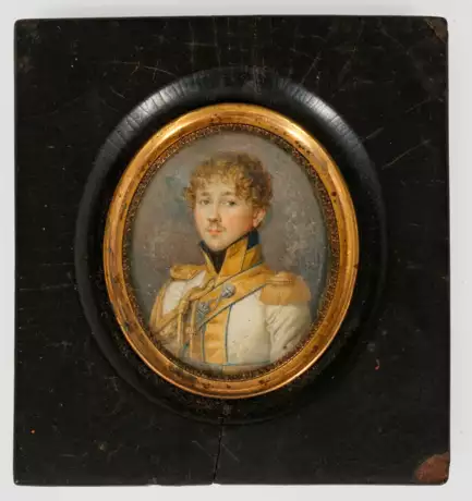 Ovaler Bildausschnitt. Vor dunklem Hintergrund die Darstellung eines Mannes in heller Uniform mit goldenen Schulterbesätzen und Troddeln. Rücks. mit biografischen Daten. Gouache auf Pappe. H. 7 cm. Rahmen.