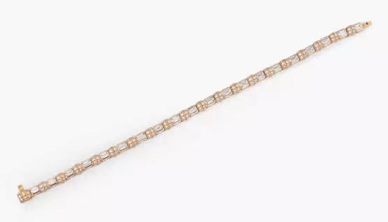 750 Gelbgold. Rivière-Bracelet mit oktagonalen Diamanten und doppelten pavégefassten Ringelementen im Wechsel, zus. ca. 3 ct. L 18 cm, 25 g. Mit Box.