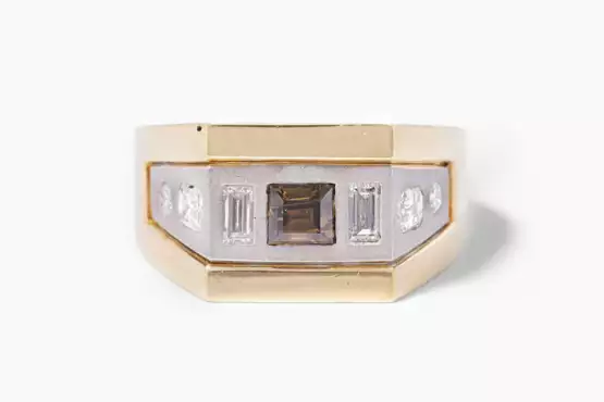 750 Gelbgold. Geradliniger Mantelring mit einem brauen, rechteckigem Diamanten, ca. 0.17 ct begleitet von je einer Diamant-Baguette von zus. ca. 0.30 ct, Ringschultern mit zwei Diamanten in Smaragdschliff, zwei Brillanten, von zus. 0.30 ct, eingelassen in satiniertem, weissgoldenen Untergrund. Gr. 57, 14 g.