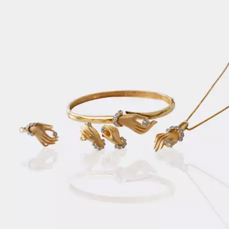 Lot 265 | Diamant Schmuck-Set mit Ohrsteckern, Ring, Armreif und Anhänger 'Delicate Hands'.