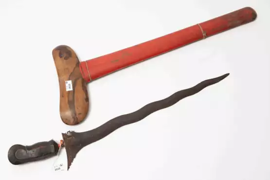 Indonesien, Bali, um 1900. Dunkel patinierter Holzgriff, Zwinge fehlt. Geflammte, dunkel patinierte und korrodierte Klinge (L 44 cm) mit acht Luk. Holzscheide en suite, Rückseite rot lackiert. L 56,5 cm.