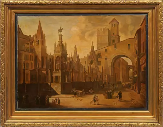 Durch Figuren belebte Ansicht der berühmten Scaliger-Grabmäler. Kopie des 19. Jhs. nach dem bekannten Original-Gemälde des bedeutenden Architekturmalers Domenico Quaglio (Vgl. Boetticher, Bd. II/1, S. 335, Nr. 62), das später in die Sammlung von Dr. Georg Schäfer gelangte und im Jahr 2000 durch Christie's in Düsseldorf versteigert wurde. Öl/Lwd.; R. u. sign. G. Lessi. Restaurierungsbedürtig. 69 cm x 96 cm. Rahmen.