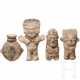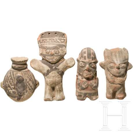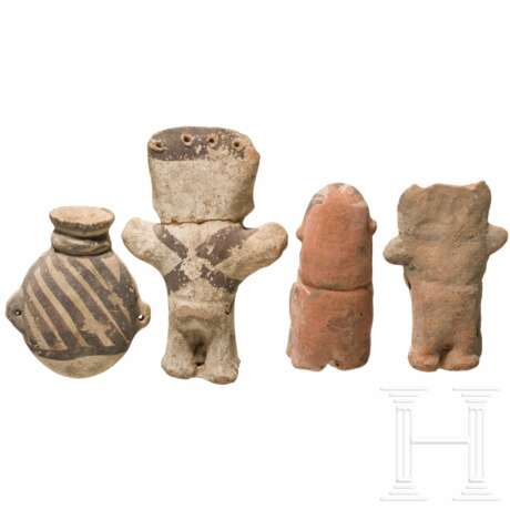 Ton, partiell schwarz bemalt. Drei plastisch ausgeformte stehende Figuren. Eine mit ausgestreckten Armen, zwei mit reliefiert vor der Brust angewinkelten Armen. Die Gesichter detailliert ausgeführt und partiell mit Linien betont. Alle Figuren mit seitlichen Lochbohrungen. Dazu eine beidseitig bemalte Plattflasche. Auf der Vorderseite reliefierte, stilisierte Tiergestalt. Seitlich zwei Handhaben. Eine Figur mit geklebtem Kopf und mehreren Bestoßungen. Eine weitere Figur stärker bestoßen, ansonsten kleine Abplatzer. Höhe 11 - 17 cm.