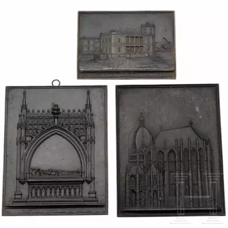 Profilierte Relief-Täfelchen aus Eisen. Die Plakette mit dem Motiv des Jahres 1829 auf der Unterkante mit "Grabmal Cunos v. Falckenstein in der Kirche St. Castor zu Coblenz" bezeichnet. Auf der Plakette von 1855 mit der Darstellung des Aachener Doms verso "Münsterkirche zu Aachen Saynerhütte MDCCCLV" gestempelt. Schließlich eine Plakette von 1843 der Königlich Preußischen Eisengießerei Berlins mit Darstellung des Stettiner Bahnhofs. Maße ca. 6,5 x 9 bis 11,5 x 9 cm.