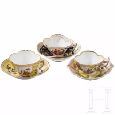 Porzellan, farbig und gold staffiert. Vierpassige Tassen und Untertassen (eine Untertasse mehrpassig), jeweils mit zwei figürlichen und zwei floralen Kartuschen. Ein Set mit kobaltblauem Fond, ein Set mit gelben Fond, eine Tasse mit rosa Fond und mehrpassige Untertassen mit gelben Fond (nicht zusammengehörig). Teils berieben. Alle Unterseite mit Unterglasurblauer Marke. Druchmesser Untertassen zwischen 12,4 und 12,6 cm, Höhe der Tassen ca. 4,5 cm.