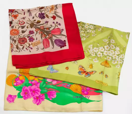 A mixed lot of three Vintage silk scarfs. Signs of use.