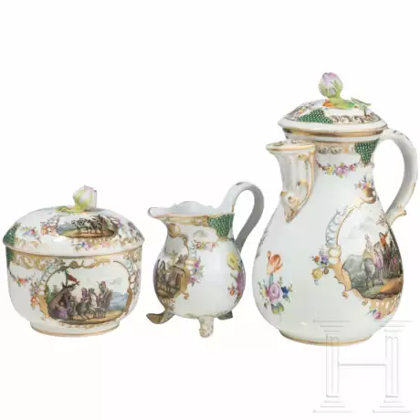 Porzellan, bunt bemalt, goldstaffiert. Bestehend aus Kaffekanne, Zuckerdose und Sahnegießer. Deckel mit plastischem Rosenknauf. Die Wandungen jeweils mit goldgerahmten Kartuschen mit feiner Watteau-Malerei entouriert von polychromen Blumen. Unterseiten mit blauer Manufakturmarke 1. Wahl (Dose mit zwei Sternen). Gold berieben. Kannendeckel mit Lochbohrung und zwei Brandrissen, Blütenstiel mit Fehlstelle. Höhe 22 cm (Kanne), 12 cm (Sahngießer).