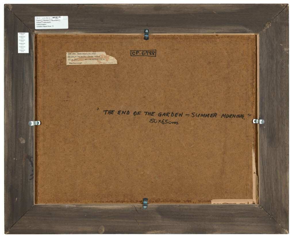 signed 'Edward Seago' (lower left) and with inscription 'THE END OF THE GARDEN - SUMMER MORNING.' (on the reverse)