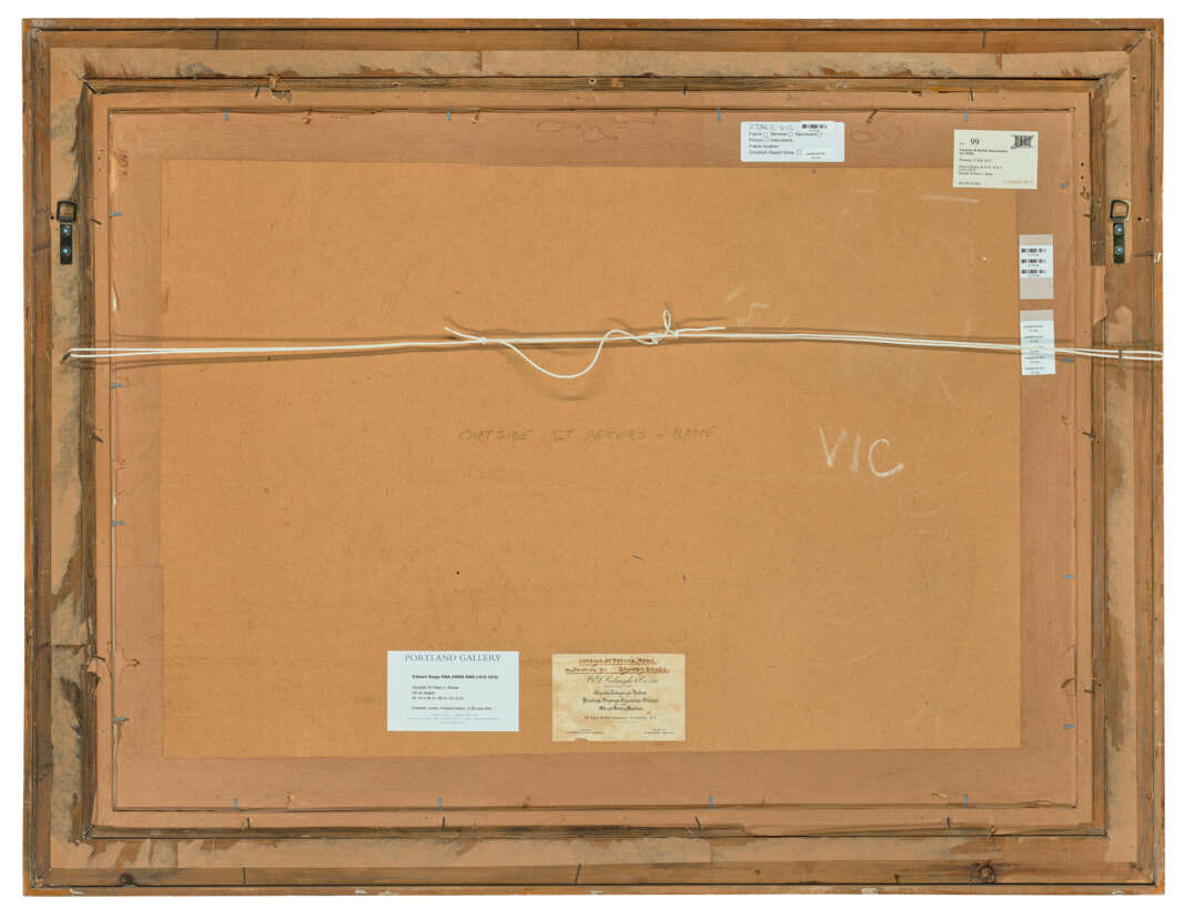 signed 'Edward Seago' (lower left) and with inscription 'OUTSIDE ST. PETER'S - ROME' (on reverse)