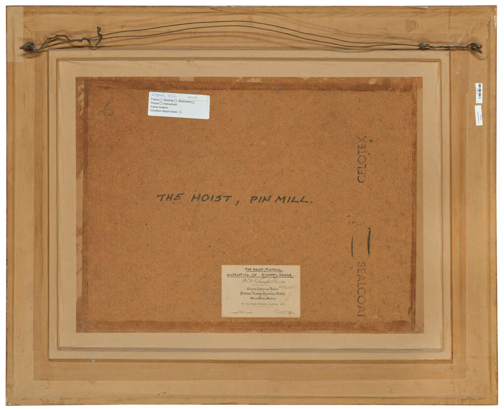 signed 'Edward Seago' (lower left) and with inscription 'THE HOIST, PIN MILL.' (on the reverse)