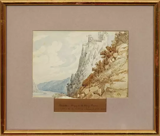 Reizvolle, unmittelbare Studie der bekannten Spornburg am Mittelrhein. Compton absolvierte seine Ausbildung in seiner Heimat England u. a. an der Royal Academy in London und siedelte 1869 nach München über, um sich schließlich ab 1874 in Feldafing am Starnberger See niederzulassen. Bleistift und Aquarell/Papier. R. u. monogr.; Auf dem Unterlegpapier bez. "Rheinstein belonging to the King of Prussia (/) fire is lighted in the iron basket, as a beacon, to guide visitors". 15,5/18,8 cm x 21,8/12 cm (Passepartoutausschnitt). Rahmen.