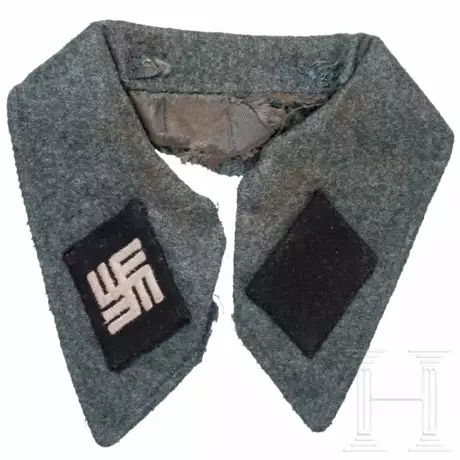 Jeweils aus feinem schwarzen Tuch, rechtsseitig mit einem Feuerkreuz in heller RZM-Stickerei. Auf den Resten des Kragens vernäht.