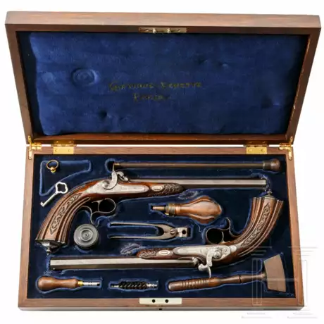 Octagonal barrels with twelve-groove rifled bores in 12.5 calibre. The upper sides with engraved signature "Fni. par Gastine-Renette à Paris". Engraved tangs with numbers "1" and "2", respectively inlaid in gold. Locks with finely engraved tendrils. Half stocks of walnut wood with fullered butts and finely cut scrollwork. Delicately engraved iron furnitures. Length of each 42.5 cm. In a matching, but not original oakwood case, the lid with band inlays and vacant brass plaque. Lockable, key is enclosed. The interior lined with blue velvet, inside the lid gold-embossed manufacturer's mark. Extensive accessories comprising powder flask, bullet mould, nipple wrench, loading hammer, patch can and cleaning rod (replaced). Dimensions 8 x 50 x 30 cm.