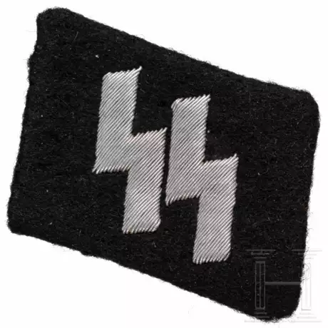 Rechtsseitiger Spiegel aus feinem schwarzen Abzeichentuch mit silbern gestickten Runen, rs. Klebereste des RZM-Etiketts. Minimale Mottenspuren.