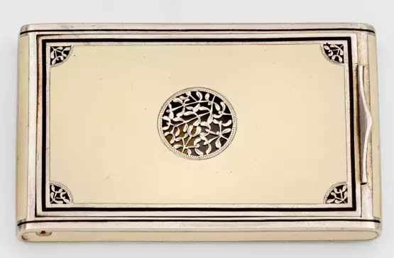 Silber, emailliert. Rechteckiger Korpus, Flächen ecrufarben emailliert. Eingelassener Scharnierdeckel mit zentraler, durchbrochen gearbeiteter, runder Kartusche mit Blattornamenten und korrespondierenden Ecklösungen. Ber.; Gest. Beschauzeichen, unidentifiziertes Meisterzeichen. Gew. ca. 160 g. H. 1 cm. 6 cm x 10 cm.