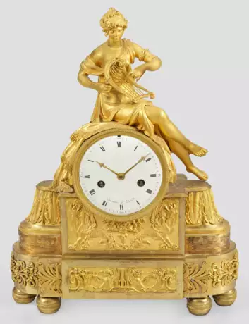 Bronze, vergoldet. Gestuft ansteigendes Uhrengehäuse mit Fries aus erhaben reliefierten Genien und Chimären mit figuraler Bekrönung in Gestalt einer jungen Harfenspielerin. Profilgerahmtes Emailzifferblatt, bez. Jeannin à Paris- Pendulenwerk mit Fadenaufhängung sowie Halbstundenschlag auf Glocke. Besch.; H. 42 cm. 31 cm x 10 cm.