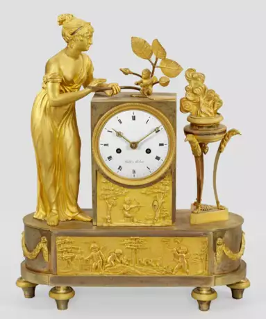 Bronze, vergoldet. Querrechteckig, seitlich gerundeter Sockel mit breitem, szenisch angelegtem Puttenfries auf Balusterfüßen. Oberhalb hochrechteckiges Uhrengehäuse sowie vollplastische Darstellung von Venus mit kleiner Amorette auf einem Rosenzweig. Profilgerahmtes Emailzifferblatt, bez. Ballif à Toulouse. Pendulenwerk mit Fadenaufhängung sowie Halbstundenschlag auf Glocke. Pendel fehlt. H. 44 cm. 33 cm x 11 cm