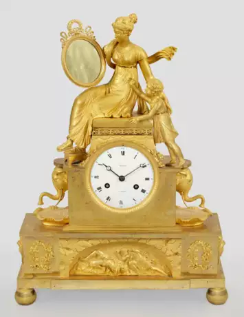 Bronze, feuervergoldet. Über querrechteckigem, szenisch angelegtem Sockel gekantetes Uhrengehäuse, flankiert von Elefantenköpfen. Vollplastische Bekrönung einer jungen Dame und eines Kindes mit einem Spiegel als Sinnbild für das Vergehen der Zeit. Profilgerahmtes Emailzifferblatt, bez. LePaute à Paris. Pendulenwerk mit Fadenaufhängung sowie Halbstundenschlag auf Glocke. Pendel fehlt. H. 48 cm. 35 cm x 12,5 cm.