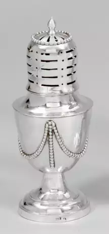 Silber. Über trompetenförmigem Stand vasenähnlicher Korpus mit abgesetzter Schulter. Glatte Wandung und ornamental durchbrochen gearbeiteter Streukopf umzogen von Perlschnüren. Gest., Stadtmarke, Meister Carl Vogel (wird Meister 1797). Gew. ca. 275 g. H. 19 cm.
