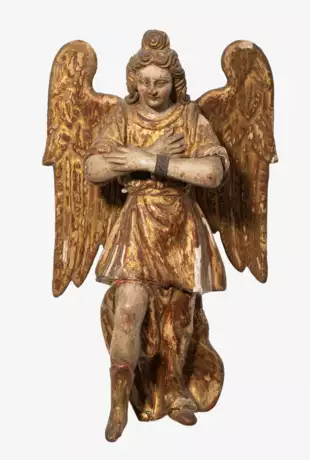 Italien, um 1700. Holz geschnitzt, polychrom gefasst und vergoldet. Engel in faltenreichen Gewändern und Stiefeln, die Hände vor der Brust gefaltet. Flügel ergänzt. H 44,5 cm.