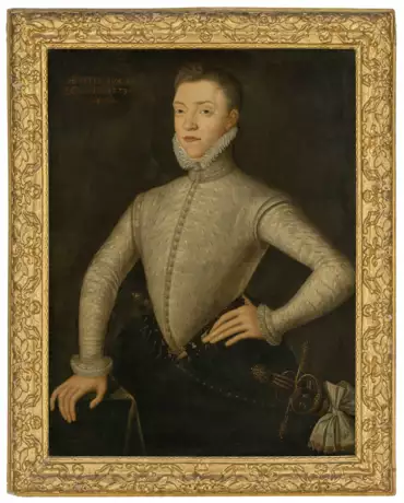 Portrait of Charles Stuart, 5th Earl of Lennox (c. 1556-1576), three-quarter-length, in a white slashed doublet and black breeches