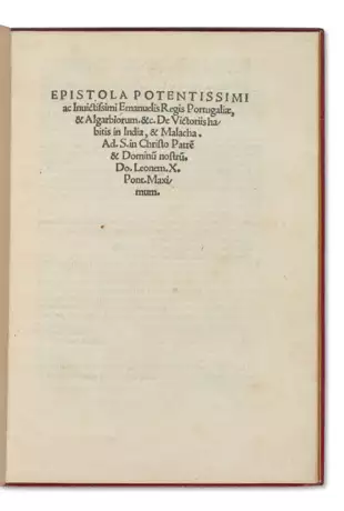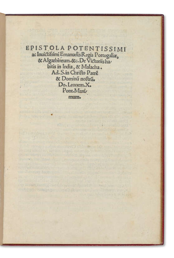Second[?] Latin edition of the letter from the King of Portugal to Pope Leo X reporting on the conquest of Malacca. See lot 37 for a description of the contents. This edition includes an introduction by Jakob Spiegel (1483-1547), a prominent humanist at the court of Maximilian I. The quotation above is included in his introduction and loosely translates as: "God will make one of all nations / He lays the path by which he can join / Sunrise and sunset with easy commerce." VD16 P 4374.