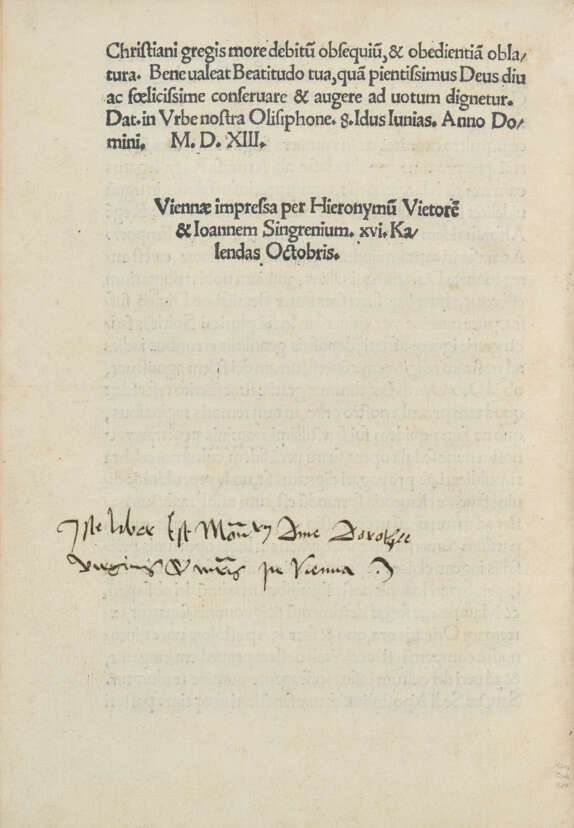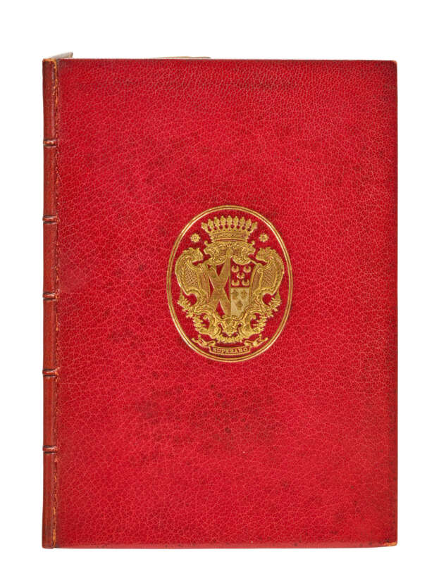 Quarto (210 x 143mm). Four leaves. Woodcut arms of Portugal on the title (pressed). Full red morocco by Chambolle-Duru, gilt turn-ins, edges gilt (tips rubbed, boards mildly darkened). Provenance: Dorotheerkloster, Vienna (contemporary ownership inscription on colophon page) – José Pinto Leite, 2nd Count of Penha Longa, 1871–1956 (supralibros) – with Maggs Bros., A Royal Catalogue issued to Commemorate the Silver Jubilee of H.M. King George V, 1935, catalogue 606, no. 582 – José Mindlin (1914-2010; bookplate).