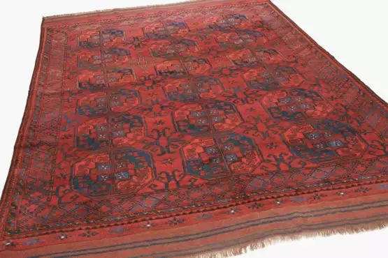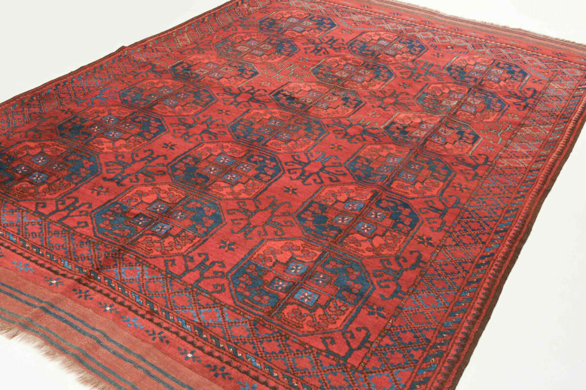 Afghanistan, um 1900. Auf rotem Grund figurieren in 3 Reihen je 6 grössere Ersari-Göls, flankiert von elegant gezeichneten Gitterhaken und Sternblüten. Mehrere Borten säumen die Hauptbordüre, die mit gereihten Rauten und Kreuzblüten auf dekorative Weise geschmückt ist und einen stimmigen Rahmen bildet. Gute Erhaltung. 220x295 cm (ft. 7.3x9.7).