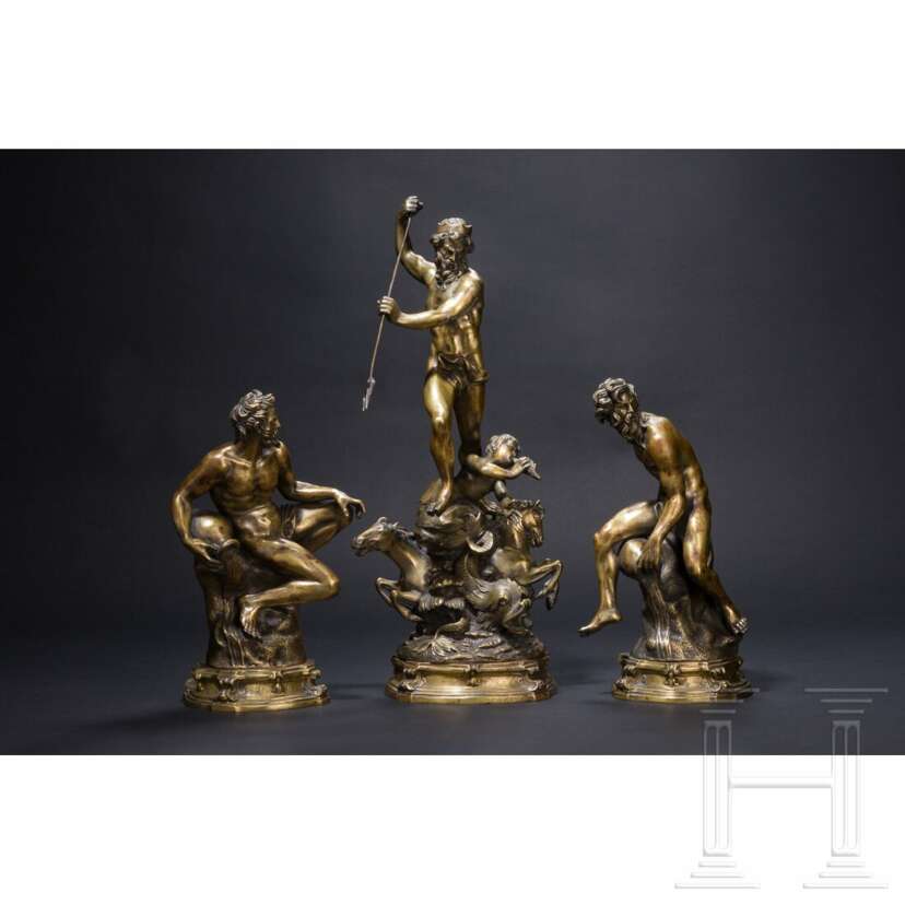 Prächtige Figurengruppe im Stil des Barock aus vollflächig in Resten versilbertem Messing. Auf einem mächtigen Felsen, vom kraftvoll emporstrebenden Wasserstrudel mit daraus hervortretenden Delfinen und Hippocampen gehalten, schreitet, seinen zum Boden gerichteten Dreizack schwingend, der bärtige Meeresgott Neptun voran. Zwischen seinen Beinen verkündet ein jugendlicher Triton, in eine Muschel blasend, den Triumpf des Gottes. Die Körperhaltung des Neptun erinnert an die berühmte Skulptur Stoldo Lorenzis, die er im Auftrag von Cosimo I. de' Medici und Eleonora di Toledo in den 1560er Jahren für einen der bedeutendsten Brunnen der fürstlich-mediceischen Boboli-Gärten in Florenz schuf. Die triumphale Neptungruppe wird von zwei muskulösen, in stark verdrehten Stellungen auf grob punzierten Felsen sitzenden Flussgöttern flankiert. Die Figuren jeweils auf profiliertem Sockel aus Messing mit Voluten-Dekor zur Betonung der Ecken. Jeder der drei großen Felsen "E. Avolio" signiert. Höhe des Neptun 52 cm, Höhe der Flussgötter 31 - 32 cm.
