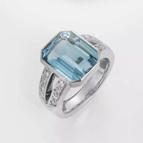 Weißgold, gest. 750. Zentral besetzt mit einem eisblauen Aquamarin von ca. 7,22 ct. im Emeraldcut, flankiert von Brillanten von ca. 0,32 ct. (F-G/vsi). Herstellerzeichen SMU. Gew. ca. 14,49 g.
