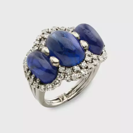 Ring set with three sapphire cabochons and diamonds of approx. 1,35 ct., in 18 k white gold.