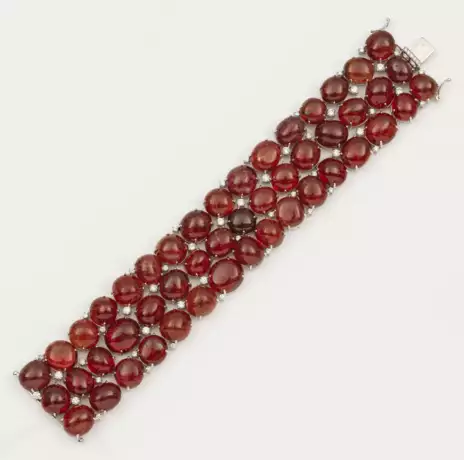 Bracelet set with red-brownish spinels approx. 301,50 ct. and small diamonds approx. 2,10 ct., in 14 k white gold. Certificate included.